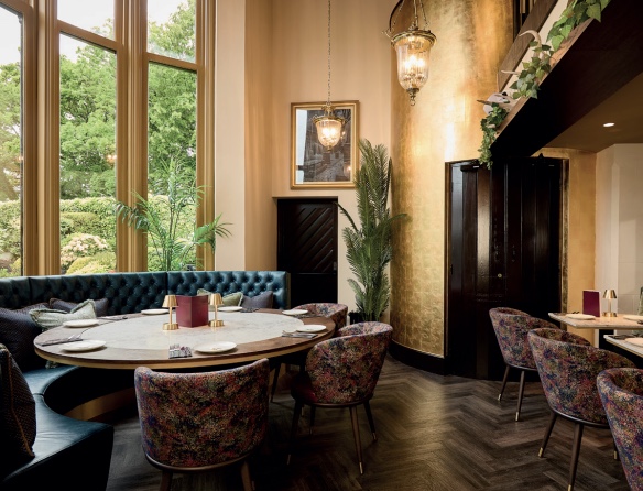 The new 80-cover dining area draws inspiration from old-world libraries, brought to life through a rich palette of earthy tones and burgundy, illuminated with touches of gold.